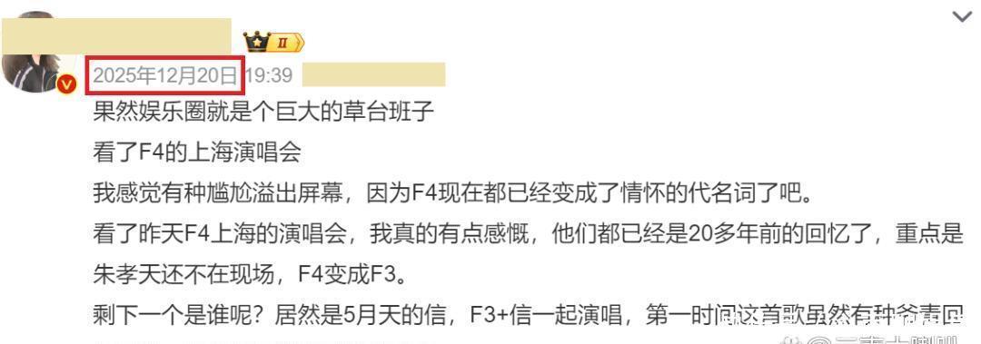 画面显示,该视频部分内容拍摄于2025年12月20日。而这个时间,恰好是F4重组巡演上海站结束的次日,也正是朱孝天陷入争议的那个主要时间段。