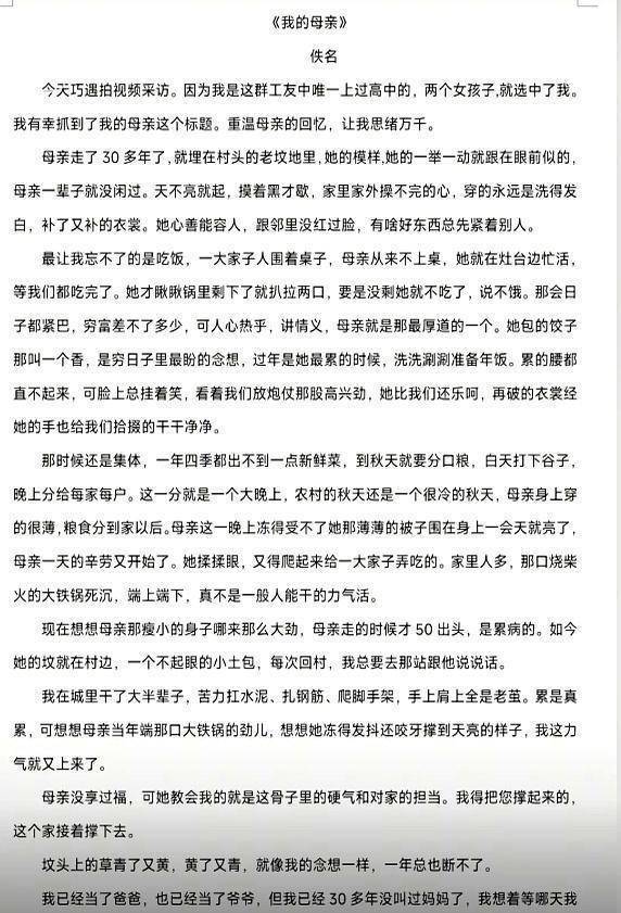 官媒点赞的“最质朴文学”,怎么就成了网友口中的“流量骗局”?或许是我们看惯了精致的摆拍,忘了真正的生活本就带着泥土味。安大叔写母亲端铁锅时“后背总像被雨水泡过”,写自己打工摔断腿时“第一个念头是妈要是还在,准会用头巾给我包伤口”——这些没加滤镜的文字,戳痛了每个在异乡打拼的人。当有人质疑“农民工哪会用‘灶台春秋’这种词”时,山西老家的乡亲们晒出了安大叔珍藏的旧课本:泛黄的纸页上,密密麻麻抄着《母亲》里的段落。 如今安大叔换了工地,手机也设了陌生号码拦截。他说那1000块奖金给孙子买了新书包,剩下的钱给工友们加了顿肉菜。至于那篇火遍全网的作文,被他折成小方块塞进贴身的口袋,“想妈的时候就摸一摸,比啥都管用”。这个夏天最动人的故事,到头来不过是个老农民用真心换真心,却被流量世界搅得不得安宁。或许我们该问问自己:当一个普通人捧出赤诚,我们配不配好好接住?